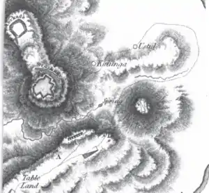 The Nalapani fort was situated on a 500–600-foot (150–180 m) hill that was covered in dense jungle. The approach to the fort was very steep in most directions and the top of the hill, which formed a tabletop feature, was about .75 miles (1.21 km) in length. Its highest point was to the south, where the town of Kalanga was located.[14] The fort was constructed in an irregular shape, having been built to conform with the shape of the ground upon which it was situated, and at the time the British entered the Dun Valley, its walls had not been finished. Upon their arrival, the British found the Nepalese defenders working to improve the fort's defences and raising the height of the walls.[14]