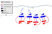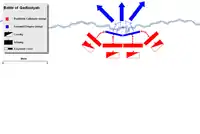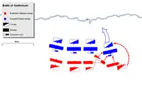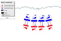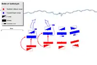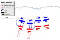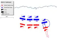 The site of the Battle of Qadisiyyah, showing Muslim army (in red) and Sassanid army (in blue)