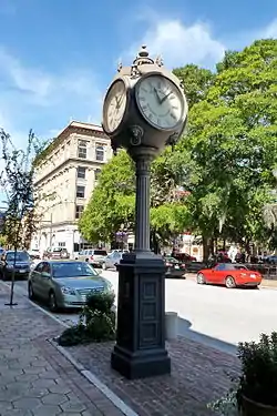 Baxter Clock is a historic street clock located in New Bern, North Carolina. It was manufactured in 1920 by the Seth Thomas Clock Company, and erected in 1930 opposite the front entrance of Baxter's Jewelry Store. The four-sided clock has brass and steel works contained in a spherical cast iron case which consists of three stages. It was listed on the National Register of Historic Places (NRHP) in 1973, but in 1977, an accident resulted in the broken clock being placed in storage for almost fourteen years. The Baxter Clock is thought to be one of three operating clocks of its kind remaining in the country.[2]