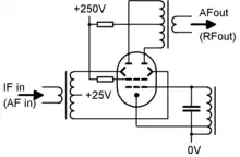 They can be used as two-quadrant, single-balanced mixers or (de)modulators with very linear qualities. Their mode of operation is similar to one-half of a Gilbert cell by applying an unbalanced signal f1 to the control grid and a balanced signal f2 to the deflection electrodes, then extracting the balanced mixing products f1 − f2 and f1 + f2 from the two anodes.[1][2] Similar to a pentagrid converter, the cathode and the first two grids can be made into an oscillator. Two beam deflection tubes can be combined to form a double-balanced mixer.