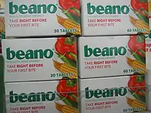 Beano is an enzyme-based dietary supplement that is used to reduce gas in the digestive tract, thereby improving digestion and reducing bloating, discomfort, and flatulence caused by gas. It contains the enzyme alpha-galactosidase (α-GAL). It was introduced as a liquid, but that has been discontinued and it is now available only as tablets and strawberry-flavored "Meltaways".
