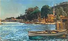 The single most beautiful building in Bebek is the huge waterfront mansion that now houses the Egyptian Consulate but that was originally built in 1902 for Emina Ilhamy (Emine Hanım), mother of Abbas Hilmi, the last Khedive of Egypt, in the days when the Egyptian nobility liked to spend their summers on the Bosphorus.[4] When he was overthrown as khedive in 1914 Abbas Hilmi donated the mansion to the Egyptian government for use as an embassy (it was downgraded to a consulate in 1923 when Atatürk moved the Turkish capital to Ankara). Designed in Art Nouveau style with sweeping mansard roofs probably by the Austrian architect, Antonio Lasciac, it was completely restored in 2010.