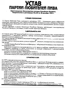 According to its statute, "the major goal of the BLP is the struggle for the cleanness and quality of the national beer, state independence and the neutrality of Belarus, freedom of economic relations, personal inviolability and the inviolability of private property".