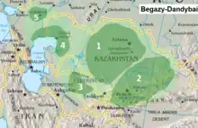 Begazy-Dandybai culture is a late Bronze Age culture of mixed economy in the territory of ancient central Kazakhstan, Kyrgyzstan, and Uzbekistan, centered at Saryarka region. The culture, with its megalithic mausolea dates from c. 1350-1150 BCE,[1] but was previously dated between the 12th and 8th centuries BCE,[2] or from 13th to 10th centuries BCE.[3][4] The culture was discovered, first excavated, and published in the 1930s-1940s by M.P. Gryaznov, who took it for a local version of the Karasuk culture. In 1979 the Begazy-Dandybai culture was described and analyzed in detail in a monograph by A.Kh. Margulan, who systematically reviewed accumulated material and produced description of the archeological culture.[5] The most famous monuments of Begazy-Dandybai culture are Begazy, Dandybai, Aksu Ayuly 2, Akkoytas, and Sangria 1.3, it was named after the first two archeological sites.