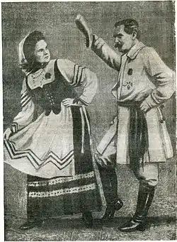 Ihnat Bujnicki, who founded the Belarusian National Theatre in 1907, played a major role in the emergence of stage folk dance. His repertoire included more than a dozen dances.[2] Bujnicki leveraged his powers of creative observation and his great musical talent to accurately capture the style of the dances. He created a bright, dynamic, folklore-faithful representation that originated the national ballet.[18]