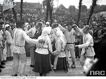 Belarusian folk dance (Belarusian: Беларускі народны танец) is a Belarusian folk dance art, presented in the form of folk domestic or staged scenic dance.[1][2] The history of Belarus and efforts to preserve Belarusian traditions have shaped the dances in use today, which have many ancient and archaic elements.[3] These dances started to form in the 14th century, and originated in East Slavic rites. In the middle of the 19th century, traditional folk dancing began to merge with quadrilles and polkas from Western Europe.