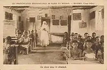 The educational system was dominated by the Catholic Church—as was the case for the rest of Belgium at the time—and, in some rare cases, by Protestant churches. Curricula reflected Christian and Western values. Even in 1948, 99.6% of educational facilities were run by Christian missions. Indigenous schooling was mainly religious and vocational. Children received basic education such as learning how to read, write and some mathematics. The Belgian Congo was one of the few African colonies in which local languages (Kikongo, Lingala, Tshiluba and Swahili) were taught at primary school. Even so, language policies and colonial domination often went hand in hand, as evidenced by the preference given to Lingala—a semi-artificial language spread through its common use in the Force Publique—over more local (but also more ancient) indigenous languages such as Lomongo and others.[58] In 1940 the schooling rates of children between 6 and 14 years old was 12%, reaching 37% in 1954, one of the highest rates in sub-Saharan Africa. Secondary and higher education for the indigenous population were not developed until relatively late in the colonial period. Black children, in small numbers, began to be admitted to European secondary schools from 1950 onward. The first university in the Belgian Congo, the Catholic Jesuit Lovanium University, near Léopoldville, opened its doors to black and white students in 1954. Before the foundation of the Lovanium, the Catholic University of Louvain already operated multiple institutes for higher education in the Belgian Congo. The Fomulac (Fondation médicale de l'université de Louvain au Congo), was founded in 1926, with the goal of forming Congolese medical personnel and researchers specialized in tropical medicine. In 1932 the Catholic University of Louvain founded the Cadulac (Centres agronomiques de l'université de Louvain au Congo) in Kisantu. Cadulac was specialized in agricultural sciences and formed the basis for what was later to become Lovanium University.[59] In 1956 a state university was founded in Elisabethville. Progress was slow though; until the end of the 1950s, no Congolese had been promoted beyond the rank of non-commissioned officer in the Force Publique, nor to a responsible position in the administration (such as head of bureau or territorial administrator).