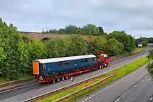 In December 2014, IÉ 201 Class locomotive number 229 moved the rake of eleven vehicles from Dublin Heuston Inchicore Works to Dublin North Wall sidings.[10] The Mark 3 carriages in the rake were ordered as 7601, 7149, 7104, 7129, 7169, 7158, 7171, 7122, 7130, 7116 and 7137.[11] Ten of the carriages were transported by road to Scotland in 2015 for refurbishment and painting.[12][13] However, 7122 remained in Dublin and as of December 2016 is to be used for spare parts for the other vehicles in the set. It remains in Irish Rail's orange livery, with no refurbishment having taken place, in spite of it being purchased by Belmond.[14]