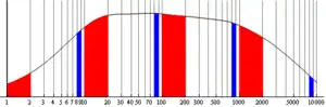 ![]() A broad probability distribution of the log of a variable, shown on a log scale. Benford's law can be seen in the larger area covered by red (first digit one) compared to blue (first digit 8) shading. |