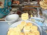 In Kolkata, many local street vendors own small shops from which they sell their own homemade goods.[26] Items like cheeses (paneer) can be eaten as is, or can be made into sweet sandesh, rosogolla, or chanar payesh. Milk is especially used in Kolkata's various types of payesh, differing in use of different grains and additives like dates, figs, and berries.[27][28] In addition to European foodstuffs like chocolate, Kolkata takes culinary influence from its Chinese diaspora.[29] Phuchka, known the rest of India as panipuri, is a common kind of Bengali street food made with a fried dough casing and a potato and chickpea filling, usually found in small stalls alongside bhelpuri, masala chai, ghugni and chaat stalls.[30]
