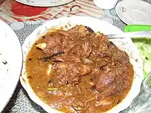 Beef-based dishes are preferred by Bengali Muslims and are a symbol of social prestige for a Mezban feast.[17] The rich and the poor arrange feasts on various occasions as much as circumstances allow them. It has a distinct style of cooking and proper Mezban meat demands a certain skill;[17] for example:[16] The unique beef curry served in this feast is known as Mezbani gosht, that carries a distinctive recipe, knowledge of which is essentially confined within the Chittagonian cooks.[18]