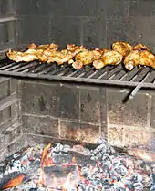 Frying in palm or peanut oil is the most common meat preparation, and smoked fish is also commonly prepared in Benin. Grinders are used to prepare corn flour, which is made into a dough and served with sauces. "Chicken on the spit" is a traditional recipe in which chicken is roasted over fire on wooden sticks. Palm roots are sometimes tenderized by soaking in a jar with saltwater and sliced garlic, then used in various dishes.
