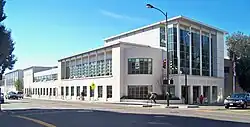 The Berkeley High School campus covers four city blocks between Milvia Street and Martin Luther King Jr. Way, and Allston and Channing Ways. The first cornerstone was laid in 1901, and the complex has been under almost continuous construction ever since, except for a decade around World War II.[48] In the late 1930s, Berkeley High was remodeled and old buildings were replaced with newer ones. The Florence Schwimley Little Theater, the Berkeley Community Theatre, and the G and H buildings are prime examples of the Streamline Moderne style designed by architects Henry H. Gutterson and William G. Corlett. The rebuilding was financed largely through Franklin Roosevelt's New Deal program the WPA.[49] They are embellished with sculptural reliefs by Robert Boardman Howard, Jacques Schnier and Lulu Hawkins Braghetta.[50]