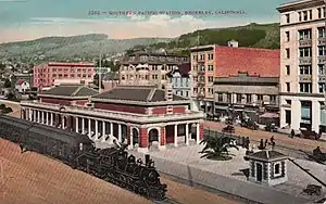 Berkeley Station began as the "Berkeley Terminus" of the Central Pacific Railroad's Berkeley Branch Railroad,[1] established in 1876, two years before Berkeley was incorporated. In 1878, the railroad was extended northward several blocks, so the "terminus" was renamed Berkeley Station. In 1885, the Central Pacific's operation of the Berkeley Branch was turned over to its affiliate, the Southern Pacific. In 1911, the Berkeley line was electrified and became part of the East Bay Electric Lines.