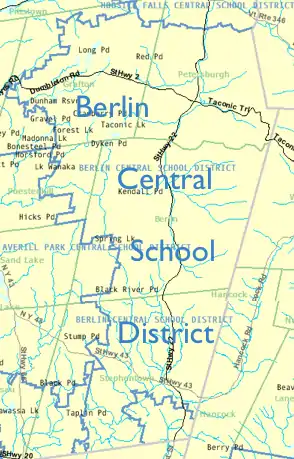 Berlin Central School District (BCSD) is a rural[2] public school district located in the eastern part of Rensselaer County, New York and borders the Commonwealth of Massachusetts. The district has two operating school buildings: one elementary school and one middle school/high school building. The district is a member of the Rensselaer-Columbia-Greene Board of Cooperative Educational Services (BOCES), known as Questar III.[3]