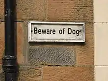 Beware of the dog (also rendered as Beware of dog) is a warning sign posted at the entrance to a building or other private area indicating that a dangerous dog is within. Such signs may be placed to deter burglary even if there is no dog, or if the dog is not actually a competent guard dog.[1][2]