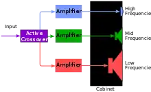 It differs from the conventional arrangement in which each channel of amplification powers a single speaker. Bi-amping typically consists of a crossover network and two or more drivers. With ordinary loudspeakers, a single amplifier can power the woofer, mid-range and tweeter through an audio crossover, which filters the signal into high- medium- and low-frequencies (or high- and low-frequencies in 2-way speakers) – a mechanism that protects each driver from signals outside its frequency range. However, the passive crossover itself is inefficient, so splitting the frequencies electronically before these are amplified is a way to avoid this problem. In such a case, an amplifier each powers a frequency range determined by an active crossover to each of the drive units. The technique is primarily used in large-scale audio applications such as sound amplification for concerts, in portable powered speakers and by hi-fi enthusiasts.