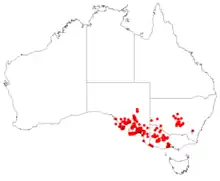This species of Billardiera mainly grows in mallee, but also in woodland and scrub, and occurs in western New South Wales, in the western half of Victoria and on the Eyre Peninsula and in the Flinders Ranges in South Australia.[2][3][4][5]