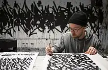 Bisco Smith has exhibited art, performed music, painted murals, and partnered with creative brands and live events worldwide such as Nike, Turner, SLS South Beach, Adidas, and Coach New York.[3] With a resume of solo and group exhibitions in New York, Los Angeles, Tokyo, Miami, Berlin, Seattle, and Hong Kong, Bisco Smith's works are sought after by collectors and art enthusiasts worldwide.[4][5] Bisco Smith is a profiled artist in The Art of Writing Your Name: Urban Calligraphy and Beyond.[6] In 2018, Bisco became an ambassador of Calligraffiti.