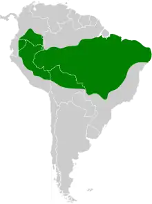 The nominate subspecies of black-fronted nunbird is widespread in the Amazon Basin. It is found in southeastern Colombia, eastern Ecuador, eastern Peru, and much of Brazil. In Brazil it occurs north of the Amazon as far east as the Rio Negro and south of the Amazon as far east as Pará and Alagoas states and south to eastern Mato Grosso do Sul and western São Paulo states. M. n. canescens is found only in eastern Bolivia.[5]