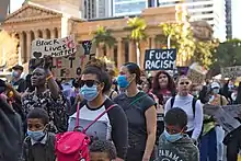 Black Lives Matter originally used various social media platforms—including hashtag activism—to reach thousands of people rapidly.[58] Since then, Black Lives Matter has embraced a diversity of tactics.[59] Black Lives Matter protests have been overwhelmingly peaceful; when violence does occur, it is often committed by counter-protesters.[60][61][62] Despite this, opponents often try to portray the movement as violent.[62][63]