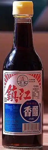Another type of Chinese "black vinegar" is Zhenjiang vinegar (simplified Chinese: 镇江香醋; traditional Chinese: 鎭江香醋; pinyin: zhènjiāng xiāngcù) and similar condiments from southern China.[2] The condiment is an inky-black rice vinegar aged for a malty, woody, and smoky flavor.[3][4] It is made from rice (usually glutinous),[5] or sorghum, or in some combination of those, sometimes including wheat and millet.[6] Black vinegar was traditionally aged in clay pots.[7]
