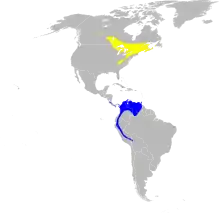 The breeding habitats of these birds are mature coniferous woodlands, the central part of their breeding range being in the southeastern portion of Canada's boreal forest. However, their distribution as a breeding species continues broadly down much of New England and the Appalachian Mountains, from New York to northernmost Georgia, in elevated mixed woodlands, especially ones containing spruce and hemlocks.[17] Hemlocks in particular are most likely to host Blackburnian warblers in mixed forests.[18] It typically winters in tropical montane forests, from roughly 600 to 2,500 m (2,000 to 8,200 ft), mainly from Colombia to Peru, more sporadically in Panama and the Amazon region.[19][20][21]