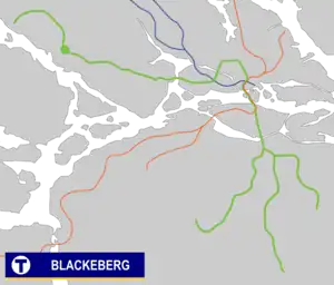 Blackeberg metro station is a station on the Green line of the Stockholm metro. It is located in the district of Blackeberg, which is part of the borough of Bromma in the west of the city of Stockholm.[3] The station has a single island platform, with access from a station building spanning the tracks. Two thirds of the platform is located outdoors and one third is located in a rock tunnel under Blackebergsplan.[4][5] The distance to Slussen is 14.1 km (8.8 mi).[1]