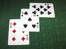 Doubling down. The third card is placed at right angles to signify that the player cannot receive any more cards.