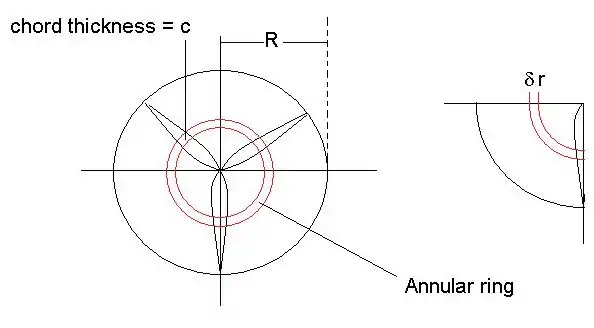 Consider the annular ring, which is partially occupied by blade elements. The length of each blade section occupying the annular ring is (see figure below).