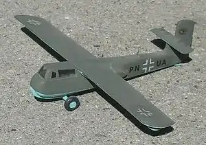 The plane was designed to use non-strategic materials and to be built in as short a time as possible by non-skilled workers. The fuselage was constructed almost entirely of wood.[2] It was of conventional layout, the glider had a high-mounted, straight untapered wing with a similarly-shaped tailplane mounted on the fin just above the fuselage. The pilot lay prone in an armoured steel cockpit in the nose of the aircraft. The front steel plate was 20 millimetres (0.79 in) thick, and was fitted with a windscreen of 120-millimetre (4.7 in) thick, armoured glass[3] that gave the aircraft a blunt-nosed appearance.