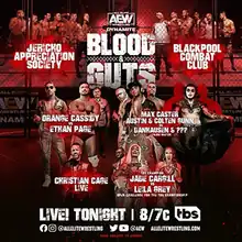 Blood & Guts featured professional wrestling matches that involved different wrestlers from pre-existing scripted feuds and storylines. Wrestlers portrayed heroes, villains, or less distinguishable characters in scripted events that built tension and culminated in a wrestling match or series of matches.[10] Storylines were produced on AEW's weekly television programs, Dynamite and Rampage, the supplementary online streaming shows, Dark and Elevation, and The Young Bucks' YouTube series Being The Elite.