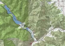 - ↑ A Google terrain map of the region shows State Route 20 runs southwest from Saratoga Springs on the edge of the Clear Lake valley, then turns northwest to run past the Blue Lakes at an elevation of 1,358 feet (414 m) and through the valley that holds Cold Creek in its northwest end. The highway then turns southwest down the Coyote Valley to Lake Mendocino at an elevation of 737.5 feet (224.8 m), which drains into Russian River.[15] The Blue Lakes would have drained along the valley that holds this section of State Route 20 before it was blocked.