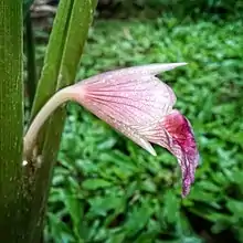 Fingerroot is a kind of ginger (Zingiberaceae). It is an annual crop and indigenous to southern Yunnan Province, China, to west Malaysia, growing in tropical rain forest.[3] It has an underground stem, known as a rhizome. This spreads into many bunches in the same way as banana, ginger, galangal and turmeric. These structures accumulate nutrients and the middle part is more swollen than the head and bottom part. The inner part has a range of colours and aromas depending on the variety of fingerroot. The above-ground part is composed of a leaf stalk that has a sheath covering it. The leaf sheaths are red, the blades are oval in shape and the apex of leaves are sharp.[4] Chinese ginger is a herbaceous plant with a height of 61–91 centimetres (2–3 ft). The leaf is about 50 cm (20 in) long and 12 cm (4.7 in) wide.[3] The middle of the petioles are deeply grooved. The flower appears between the leaf sheaths at the bottom of the trunk. The petals are white or light pink. Flowers bloom one at a time.[4]