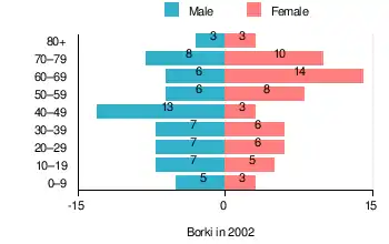 According to the 2002 Poland census, there were 120 people residing in Borki village, of whom 51.7% were male and 48.3% were female. In the village, the population was spread out, with 14.2% under the age of 18, 35.8% from 18 to 44, 14.2% from 45 to 64, and 35.8% who were 65 years of age or older.[1]