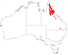 It occurs in far north Queensland to as far south as Charters Towers, and grows in woodland and shrubland, often along rivers and among rocks.[3]