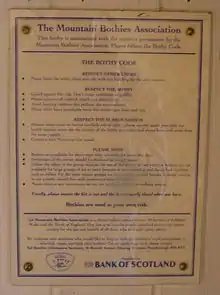 - 1 2 3 4 5 6 7 8 9 10 11 12 Staff. "Bothy Code". mountainbothies.org.uk. Retrieved 24 February 2020.