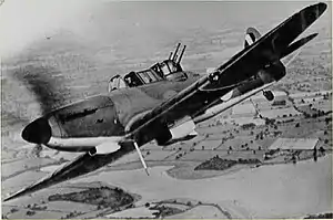 Luftwaffe fighters suffered losses when "bouncing" flights of Defiants from the rear, apparently mistaking them for Hurricanes.[35] The German pilots were unaware of the Defiant's rear-firing armament and encountered concentrated defensive fire. The Luftwaffe changed tactics, to outmanoeuvre the Defiant and attack from below or dead ahead, where the turret guns offered no defence. Defiant losses quickly mounted, particularly among the gunners, who were often unable to leave stricken aircraft. The additional weight of the turret and the second crewman plus the aerodynamic drag gave the Defiant a lower performance than conventional single-seat fighter aircraft.[36]