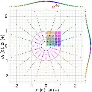 Visualisation of the Box–Muller transform — the coloured points in the unit square (u1, u2), drawn as circles, are mapped to a 2D Gaussian (z0, z1), drawn as crosses. The plots at the margins are the probability distribution functions of z0 and z1. z0 and z1 are unbounded; they appear to be in [-2.5,2.5] due to the choice of the illustrated points. In the SVG file, hover over a point to highlight it and its corresponding point.