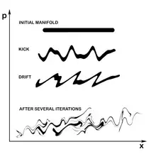 where n accounts for the discrete time, x and p are position and momentum respectively, and V is the potential. The equation for the momentum is called the “kick” stage, whereas the equation for the position is the “drift”. Given an initial manifold in phase space, it can be iterated under the action of the kick and drift map. Typically, the manifold stretches and folds (although keeping its total area constant) forming cusps or caustics and stable regions. These regions of phases space with high concentration of trajectories are precisely the branches.