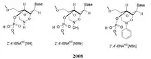 Chemical structures of BNA monomers containing a bridge at the 2', 4'-position of the ribose to afford a 2', 4'-BNA monomer as synthesized by Takeshi Imanishi's group.[2][3][4][5][6][7] The nature of the bridge can vary for different types of monomers. The 3D structures for A-RNA and B-DNA were used as a template for the design of the BNA monomers. The goal for the design was to find derivatives that possess high binding affinities with complementary RNA and/or DNA strands.