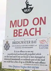 At low tide extensive areas of mudflats (the Steart and the Berrow Flats) are exposed, providing important feeding and overwintering grounds for waders (shorebirds). Invertebrate fauna including six nationally rare species and eighteen nationally scarce species can be found in the ditches and ponds around the shores.[2] Consequently, Bridgwater Bay is a national nature reserve, and is managed by Natural England.[33] Some of the potential risks to wildlife are highlighted in the local Oil Spill Contingency Plan.[4]