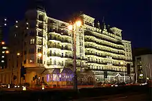 The Grand Hotel at night, 2006, the bomb damage occurred to the right of the area lacking balconies.