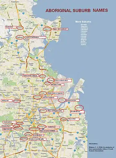 Brisbane suburb names with Aboriginal names show that some Australian Aboriginal languages are still preserved today, in the form of placenames. Similarly, F. J. Watson explains the meanings of Queensland suburb names.[1]