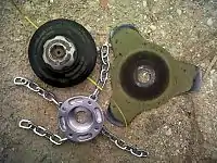 Plastic or metal flails can be used for cutting stems too large for a line head but not requiring a blade. Following an incident in the UK in which when a metal chain link thrown from an aftermarket flail killed a bystander, all flail heads are now banned in the EU.[1][2]