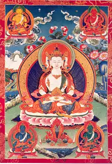 Vairocana, the first Dhyani Buddha, embodying sovereignty and occupying the center,[7] is a special case (in any case, he is distinct from Gautama and not normally confused with him). He was one of the Buddhas of Bamiyan blown up by the Taliban which China mourned and tried to replace with the world's tallest statue, named Spring Temple Buddha.[8] Japanese Pure Land Buddhists think that Vairocana and the other Dhyani Buddhas are manifestations of Amitābha, but Japanese Shingon Buddhists think that Amitābha and the other Dhyani Buddhas are manifestations of Vairocana.[9]