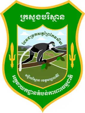 Protected area logo for Keo Seima Wildlife Sanctuary, showing a critically endangered black-shanked douc (Pygathrix nigripes), and traditional Bunong houses in the background.