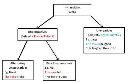 The following flow chart depicts the difference between the two types of intransitive verbs; unaccusative and unergative. Unaccusative verbs are subdivided into ergative intransitive verbs (depicted as "pure unaccusatives") and alternating unaccusatives. For more information on alternating unaccusatives see causative alternation.