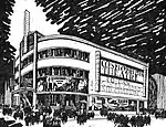 In 1934, Gonda publicized the plans for the Cosmopolitan Theatre on the border of the French Concession and the Chinese City. The six-story building was free not only from all the ornament but also “from the faults of false modernism such as is often seen.” The movie house on the ground floor accommodated 1,100 seats, and there were two floors of offices and three floors of apartments above it.[35] The entrance was sheltered by a canopy, used for lighting and for advertising; three illuminated columns above it supported allegorical figures carrying globes of floodlight. The wide proscenium arch extended over the entire front of the auditorium; the stage could be used for theatrical performances as well as for movie screenings.