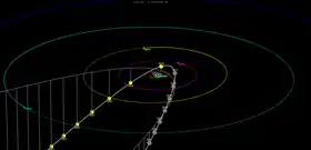 While near perihelion, A/2018 C2's heliocentric orbit is not bound to the Solar System, unlike ʻOumuamua, it is not an interstellar object. The heliocentric eccentricity drops below 1 starting with an epoch of January 2023,[7] when it is 13.8 AU from the Sun, making the orbit bound to the Sun before it leaves the planetary region of the Solar System. The more stable barycentric orbit of A/2018 C2, shows that it is only a very distant small Solar System body, approaching as far as 50,000 AU from the Sun, around the distance of the Oort Cloud. It had an orbital period of millions of years until the current approach to the Solar System, where perturbations will shorten the orbit drastically to about 5,200 AU, with an orbital period of 130,000 years.[4] Hui Man-To calculated that the comet would have its next perihelion after 130 to 140 thousands years, at a distance of about 2 AU.[8][4]